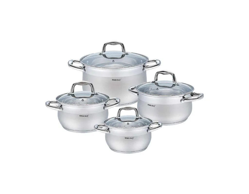 Zestaw garnków (8 elementowy) KingHoff to połączenie klasy i elegancji w nowoczesnym wydaniu. Garnki zostały wykonane z najwyższej jakości stali nierdzewnej wykończonej na zewnątrz satyną. Cały komplet garnków umożliwia szybkie gotowanie i podgrzewanie potraw, a także utrzymywanie wysokiej temperatury wewnątrz przez długi czas.