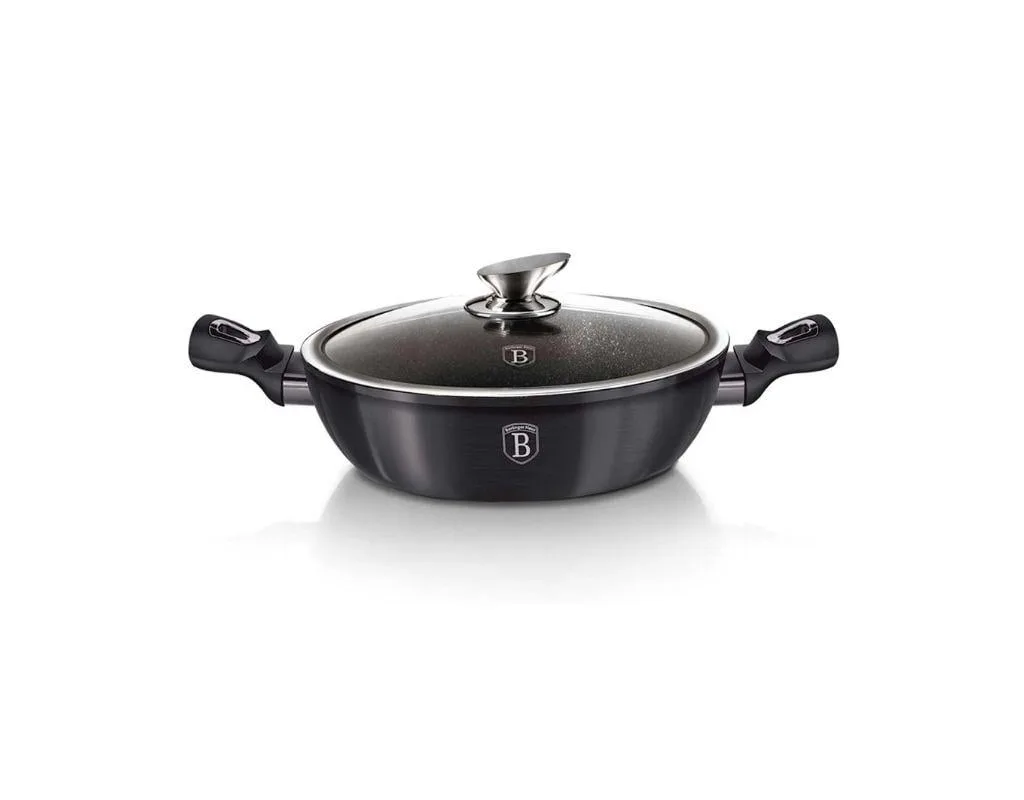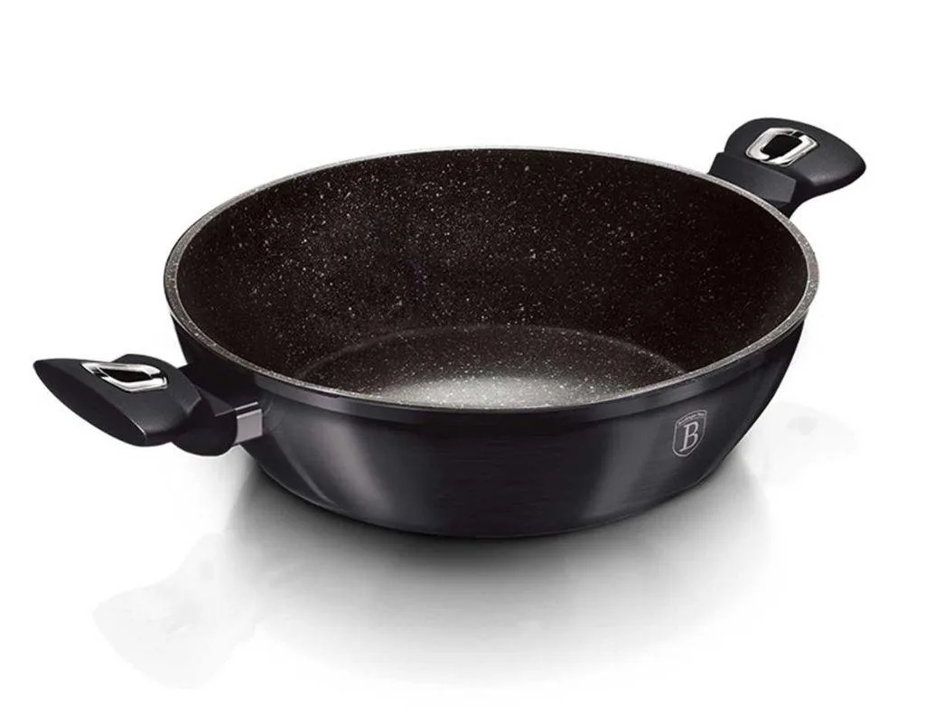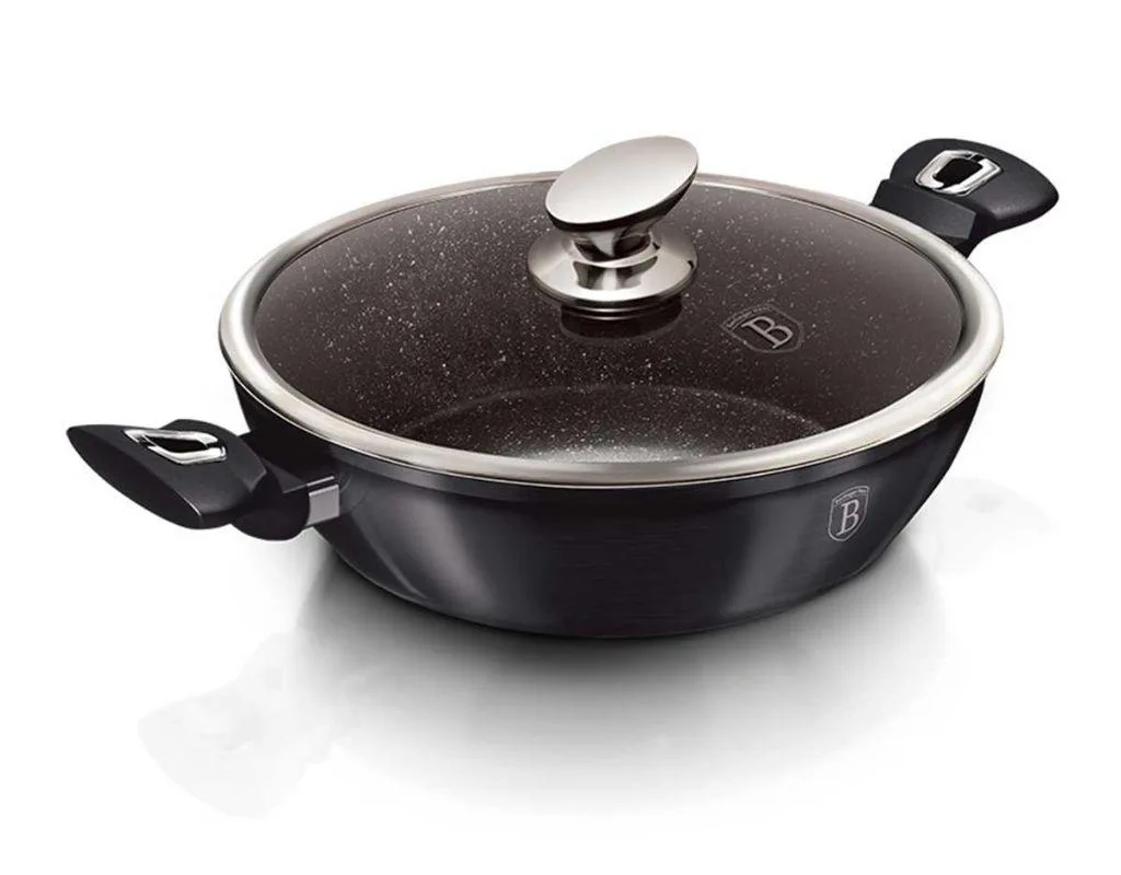Garnek granitowy płaski z pokrywką 32 cm Berlinger Haus to spełnienie marzeń dla każdego pasjonata gotowania, którego wystrój wnętrz kuchni musi być dopracowany w każdym calu. Naczynie wykonano z materiałów charakteryzujących dobre garnki kuchenne, czyli z solidnego i wytrzymałego kutego aluminium. Co więcej, jej wnętrze pokryto grubą 3-warstwową granitową powłoką zapewniającą nieprzywieranie potraw do dna naczynia. Innowacyjne turbo dno indukcyjne zostało zastosowane w każdym elemencie grzejnym zestawu, przez co oszczędza nawet do 35% energii więcej. Dodatkowo pozwala na równomierne pieczenie mięsa, warzyw i innych potraw.