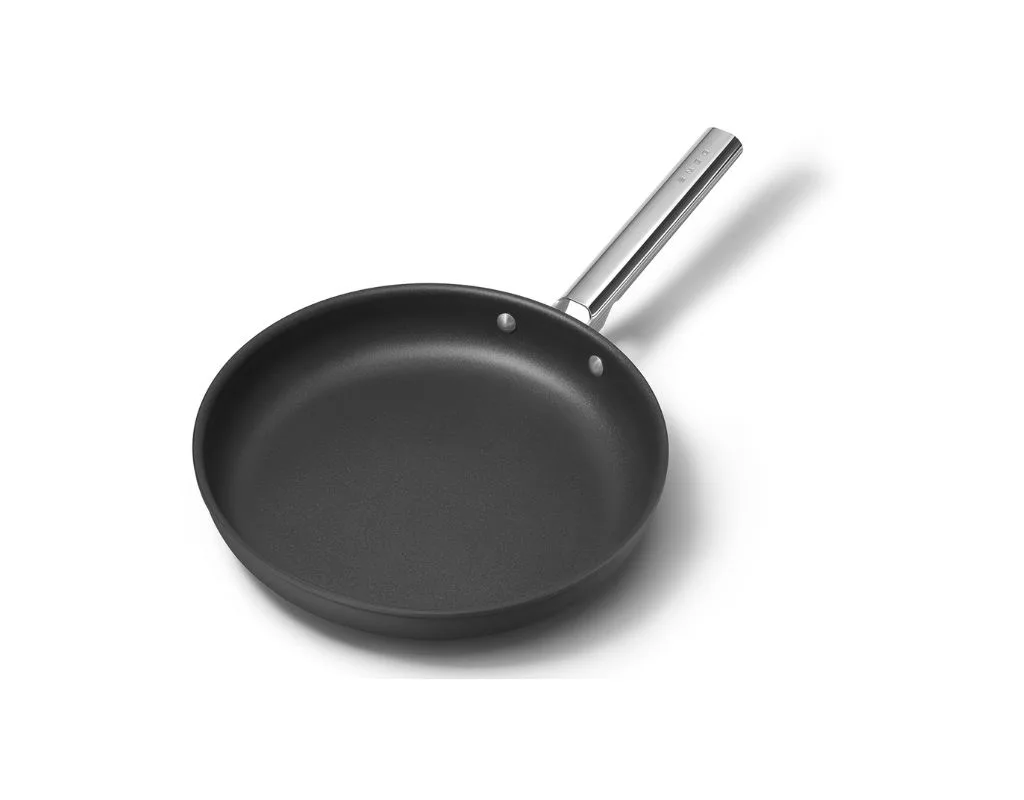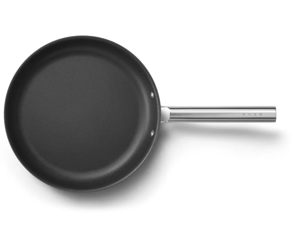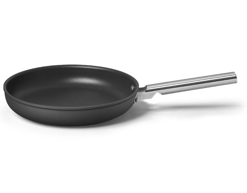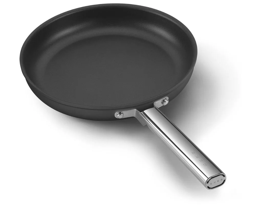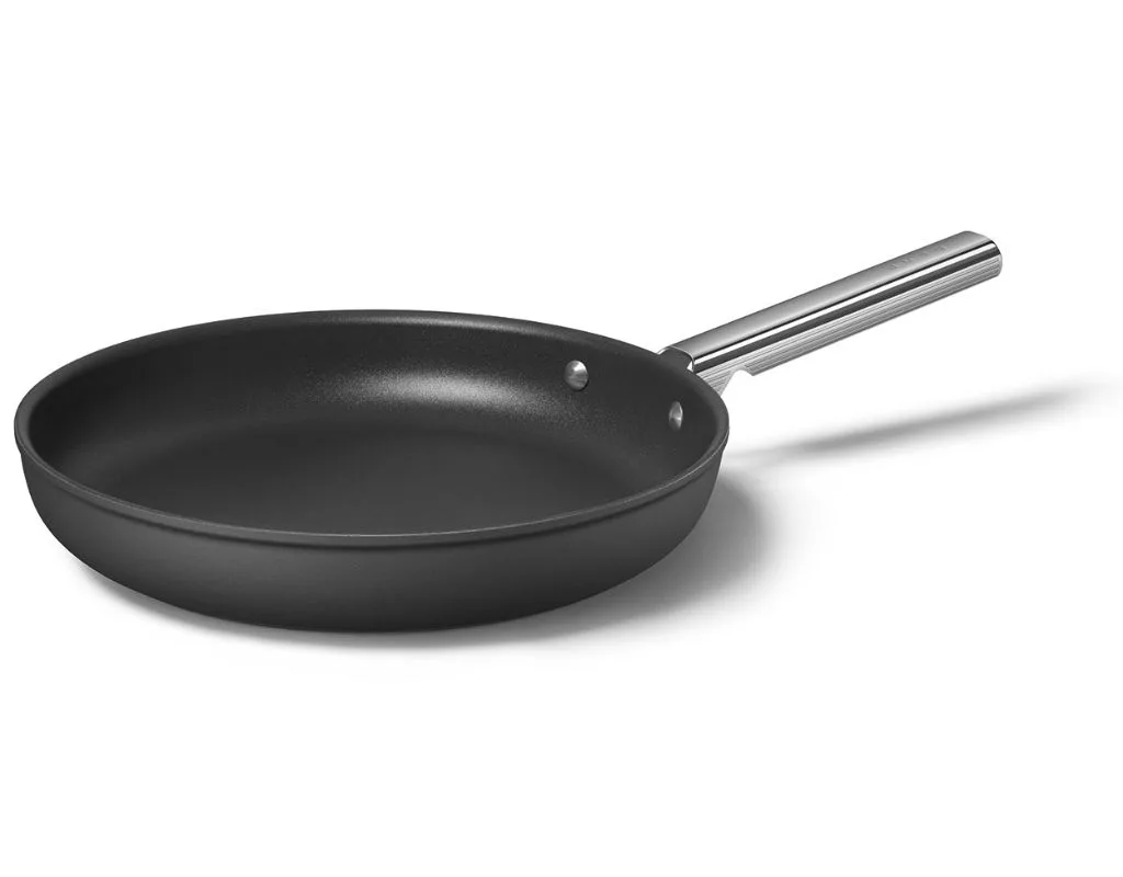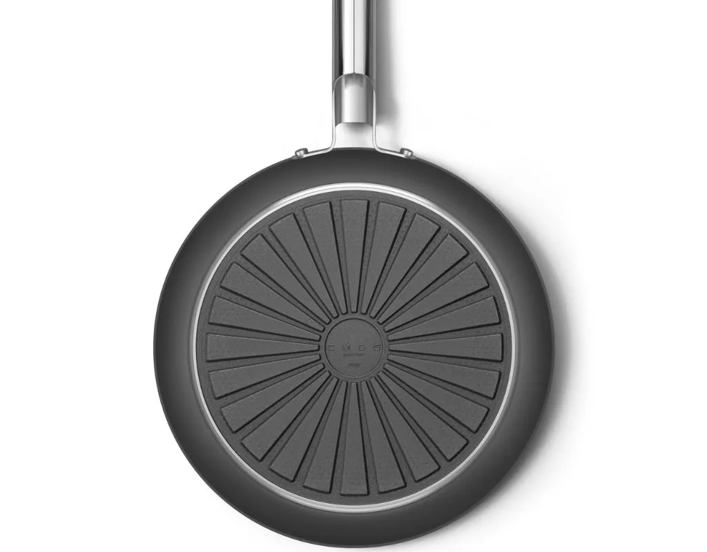 Patelnia SMEG 50’s Style została zaprojektowana z myślą o wygodzie użytkownika. Niskie boki ułatwiają korzystanie z przyborów kuchennych oraz nakładanie potraw bezpośrednio na talerz. Nitowany uchwyt ze stali nierdzewnej AISI 304 jest ergonomiczny, dobrze leży w dłoni i nie nagrzewa się w trakcie smażenia, co zwiększa bezpieczeństwo. Czarny matowy kolor i charakterystyczne wzornictwo retro sprawiają, że naczynie doskonale komponuje się z innymi urządzeniami z serii SMEG. Patelnia może być używana w piekarniku (do 250°C), a po gotowaniu bez problemu umyjesz ją w zmywarce.