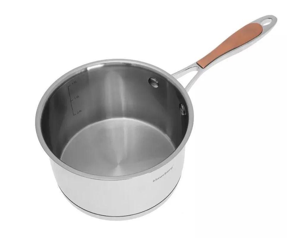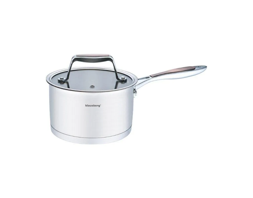 Rondel marki KLAUSBERG o pojemności 1.8 l i średnicy 16 cm wykonany z wysokiej jakości stali nierdzewnej. Dzięki zastosowanym materiałom rondel szybko nagrzewa się i zatrzymuje ciepło. Przystosowany do użycia na wszystkich rodzajach płyt grzewczych: indukcyjnych, ceramicznych, elektrycznych, gazowych i halogenowych. Zapewnia zdrowe przygotowywanie posiłków: gotowanie z niewielką ilością wody oraz niewielką ilością tłuszczu, dzięki czemu minimalizuje utratę witamin, minerałów i smaku. Praktyczna obręcz do nalewania zapobiega kapaniu. Produkt łatwy do czyszczenia, można myć w zmywarce.
